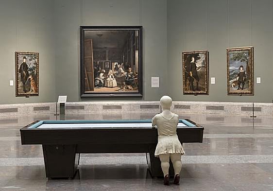 | Son muchas las exposiciones que se han realizado de Juan Muñoz desde su muerte (y nos queda la duda de si él hubiera ocupado los espacios que invaden sus enigmáticas esculturas como lo están haciendo los distintos comisarios que se acercan a su obra). Sin duda, aquella que le llevó a la Sala de las Turbinas de la Tate, y que no llegó a clausurar en persona por su repentina muerte, marco un hito. De ella nos queda su reconstrucción hoy en Planta (Lleida). | | | Pero quizás pocas con el además calor humano de la que ahora le celebra el Museo del Prado. Paseando por ella, se entienden muchas cosas de su vocabulario. Muñoz siempre reconoció su pasión por un templo artístico como este, y aquí, se comprende como en ningún otro sitio su imaginario, la teatralización de sus instalaciones, sus mensajes universales: todo eso ya estaba en los grandes maestros, de Velázquez a Goya, a los que asume que 'tomó prestado' y homenajeó a partes iguales. | | | Por eso el gran aliciente de la cita es, además, ver algunas de sus propuestas en diálogo con los grandes tesoros de la pinacoteca: Esa Sarah invitando a una partida de billar imposible frente a 'Las Meninas'; esos 'tentempie' complicando el paso en la galería Central despertando a Rubens, a Tiziano...; esos hombres suspendidos en los huecos de las escaleras... Regresar a Juan Muñoz es hacerlo a lo genuino del arte. Desen en placer y el capricho. Vicente Todolí como comisario, y todo el statement, saben bien lo que hacen. | | | Detalle de una de las obras de Juan Muñoz frente a 'Las Meninas' // | | | |