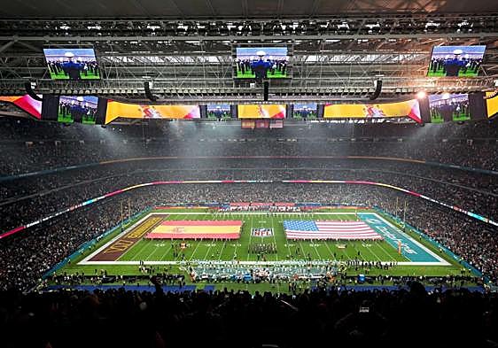 | La NFL hizo historia en el Santiago Bernabéu con un partido que combinó deporte, música y fuegos artificiales. Los Miami Dolphins vencieron a los Washington Commanders en la prórroga, en un evento con Daddy Yankee y Bizarrap como artistas invitados y 78.600 espectadores vibrando. La jornada fue un examen para la expansión del fútbol americano en España, que salió con nota alta. La organización cuidó cada detalle, desde el homenaje a la UME hasta el ambiente familiar en las gradas. El éxito del evento abre la puerta a una relación duradera entre España y la liga más mediática de EE.UU.. | | | Imagen del estadio Santiago Bernabéu con las banderas que se desplegaron para la interpretación de los himnos de Estados Unidos y España antes del partido de la NFL entre los Miami Dolphins y los Washington Commanders. // REUTERS/KIRBY LEE-IMAGN | | | |