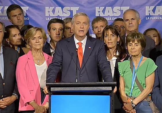 | Chile elegirá a su presidente entre la comunista Jeannette Jara y el derechista José Antonio Kast el próximo 14 de diciembre. Jara obtuvo un 26,7% en la primera vuelta -lejos del 30-33% que le otorgaban las encuestas) frente al 24,1% de Kast. Ambos lideraron una campaña centrada en el control migratorio, el combate a la delincuencia y la economía. La unidad de las derechas fue tema central en los últimos días y anoche los otros dos candidatos de derechas -Matthei (12,6%) y Kaiser (13,9%)- endosaron su apoyo a Kast. La gran sorpresa fue la votación del populista Franco Parisi, un oscuro personaje que obtuvo un 19,5% de los votos y que se ha convertido en una especie de 'kingmaker' de la política chilena. | | | Captura de pantalla tomada de la transmisión oficial del equipo de campaña del candidato a la Presidencia de Chile José Antonio Kast hablando tras conocer los resultados de las elecciones este domingo, en Santiago (Chile). Kast, que quedó segundo en las elecciones presidenciales de Chile, y pasó a la segunda vuelta contra la izquierdista, Jeannette Jara, dijo que es tiempo de «un cambio real» y de «reconstruir la patria». // EFE/KAST | | | |