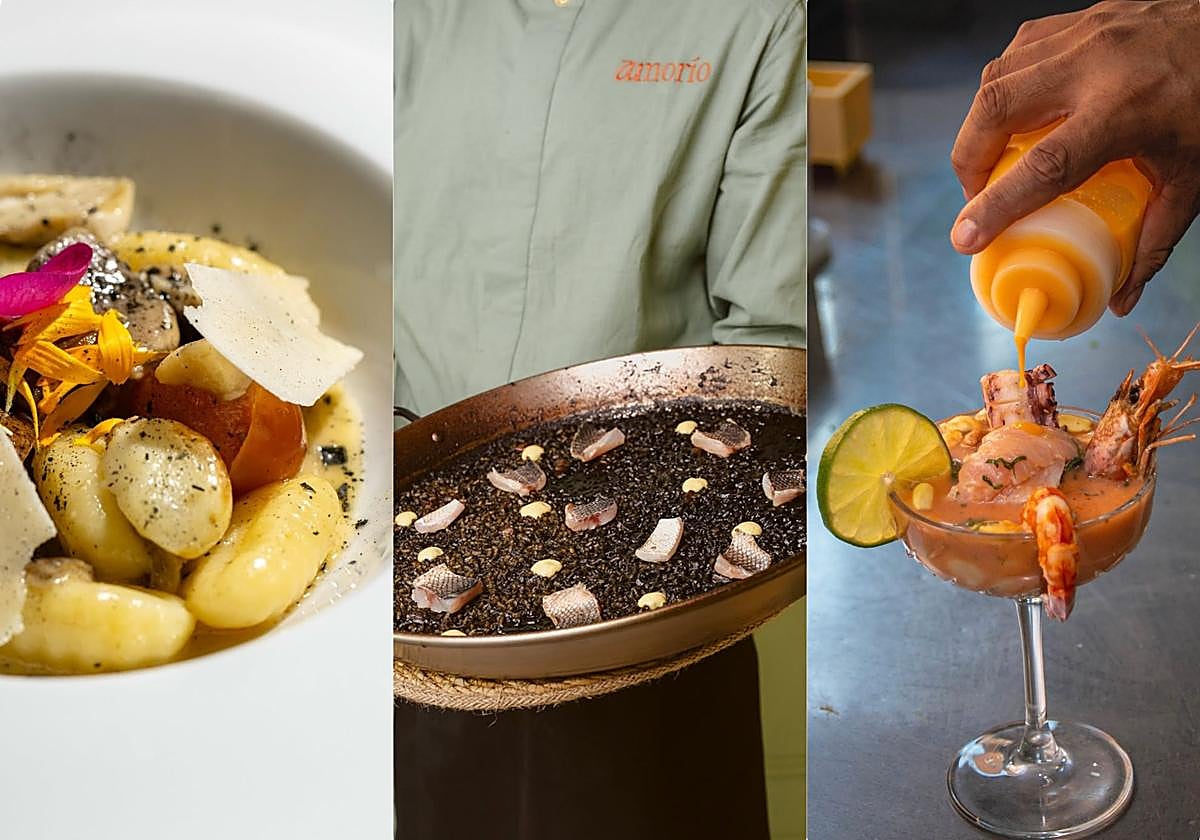 Montaje de imágenes de platos de La Recaleta, Clómada y Alaparte, tres de los restaurantes seleccionados en esta guía de 'mejores aperturas del año en Málaga' //