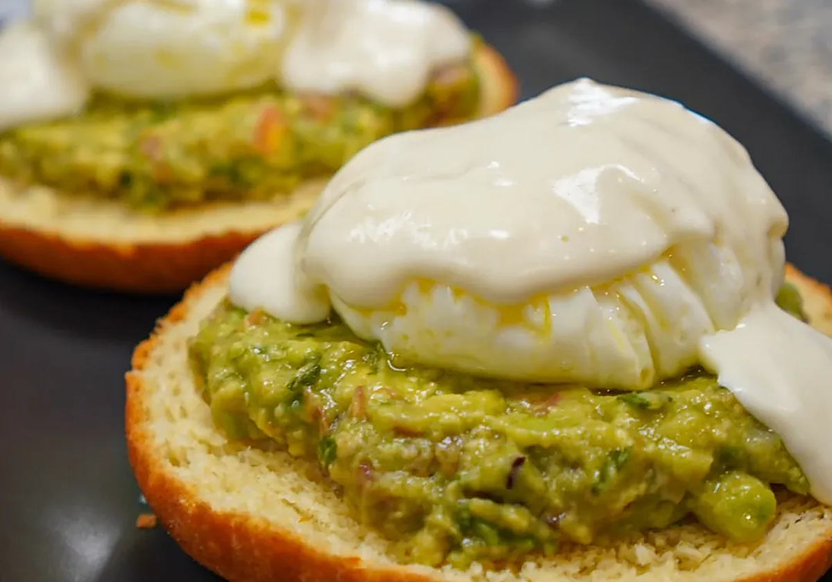 Brioche con huevos escalfados, guacamole casero y salsa de queso. //