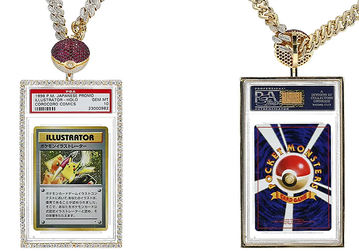 La carta está sujeta por un colgante de oro amarillo de 18 quilates con diamantes y una pokeball